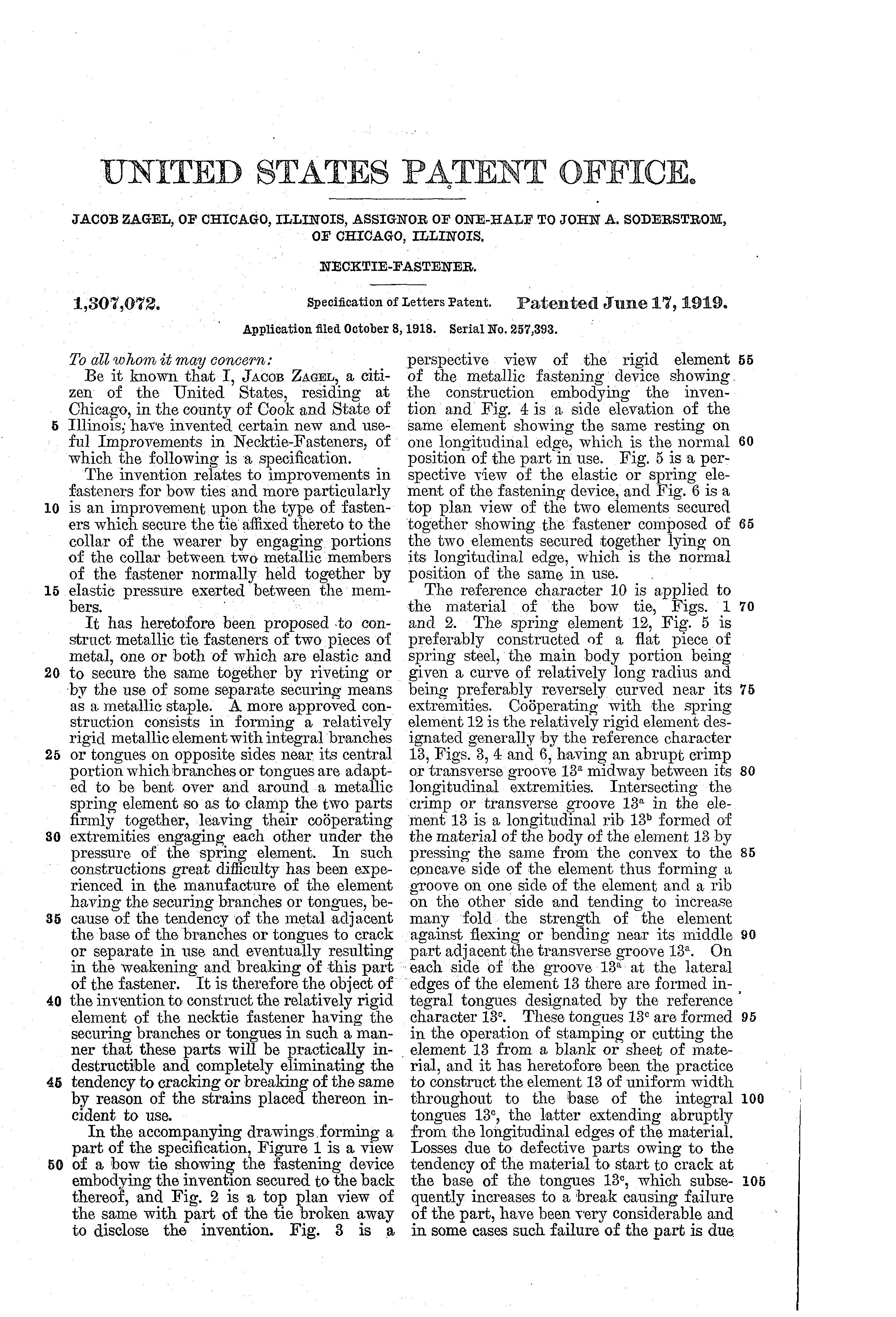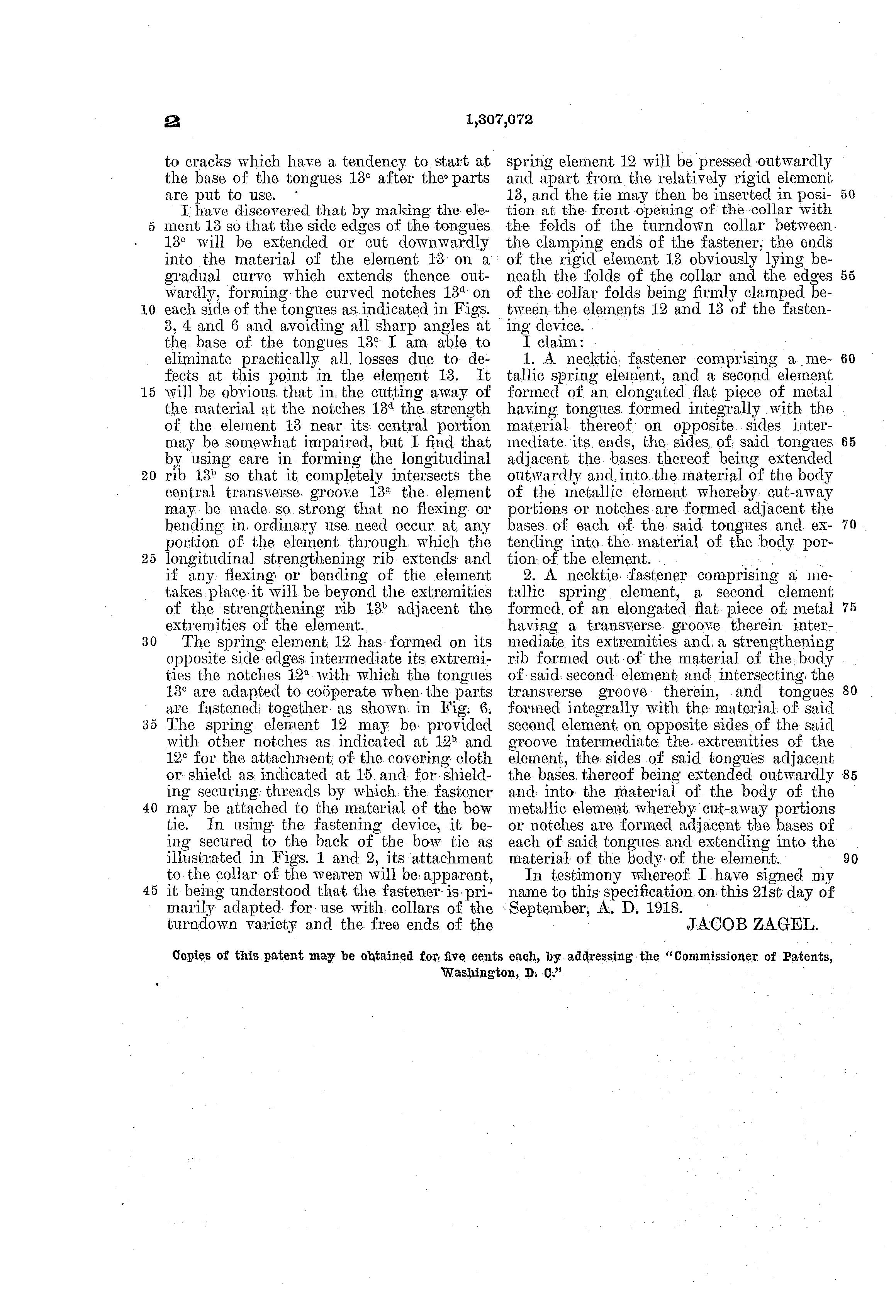 In 1919 Jacob patented (page 2 patent) an improved bow tie fastener. (The ship's manifest and patent information courtesy of Bob Roudman.)