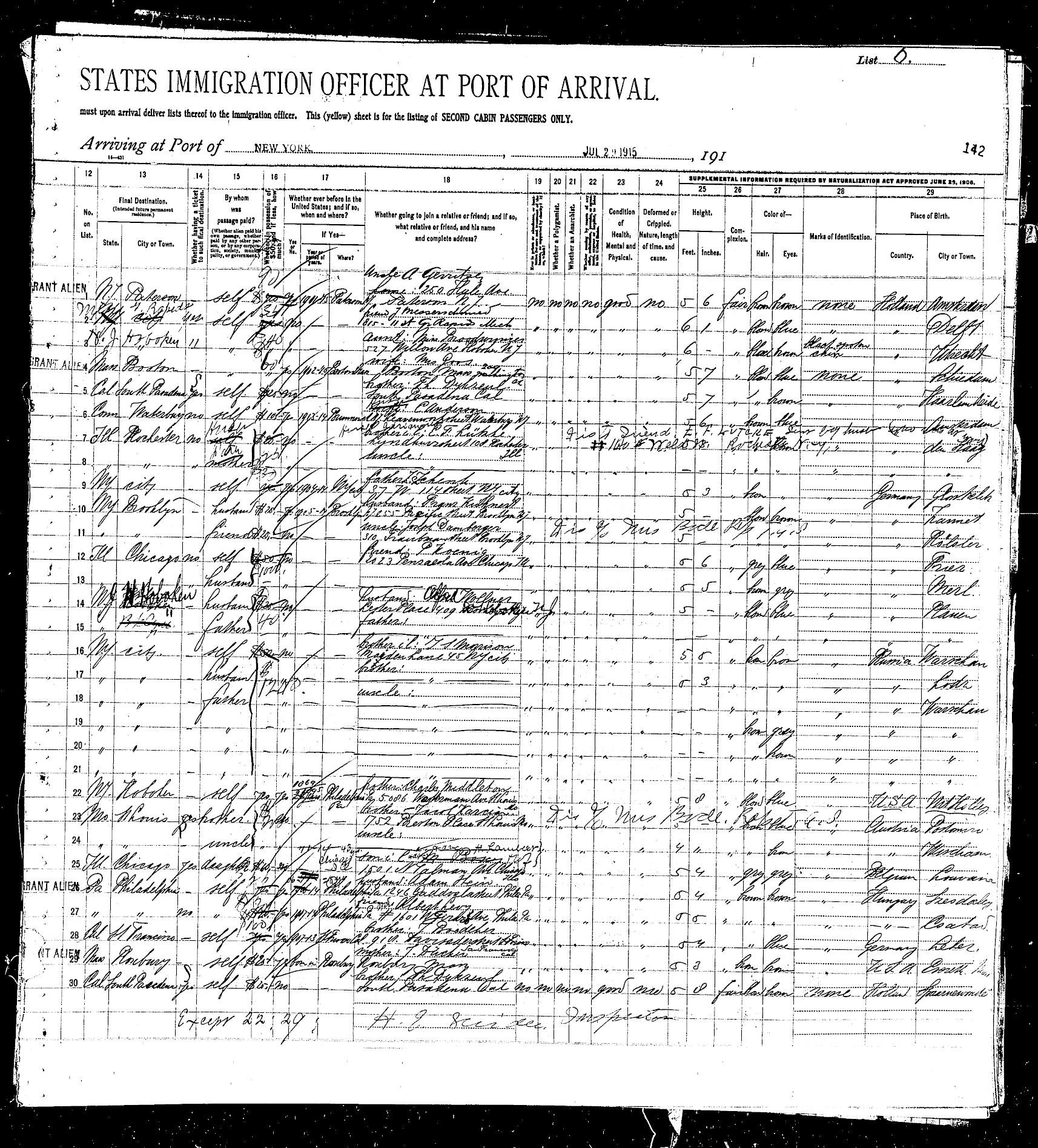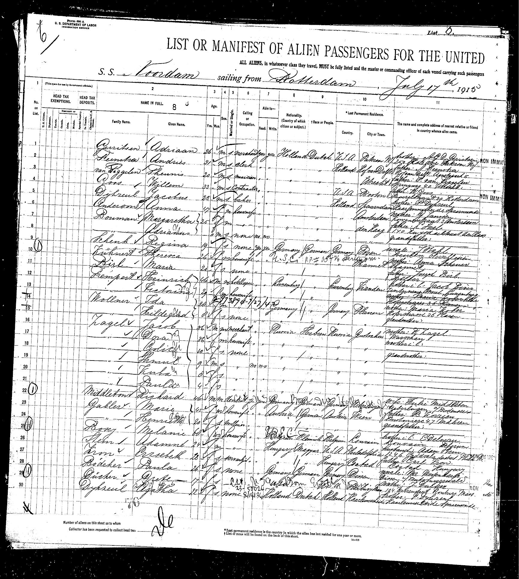 The entire family came to America together. Their residence before they emigrated was listed as Gustschow, Russia on the ship manifest (page 2 of manifest). They immigrated to the United States in 1915 on the ship Noordam. The ship departed from Rotterdam and arrived at Ellis Island on July 29, 1915.